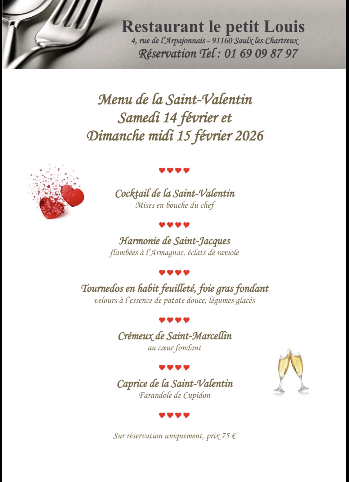 Le Petit Louis, restaurant traditionnel gastronomique à Saulx-les-Chartreux, vous accueille dans un cadre agréable à l’ambiance chaleureuse tous les midis du lundi au samedi, en soirée du mardi au samedi et le dimanche sur réservation.